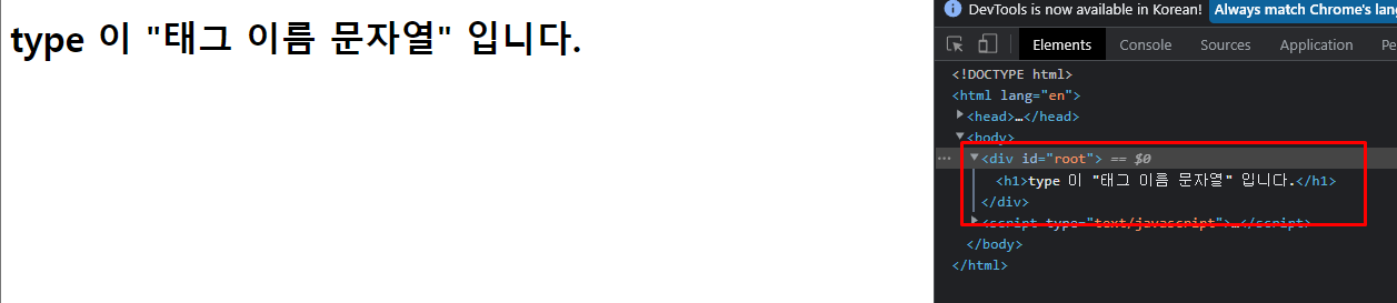 // React.createElement('h1',null,`type 이 "태그 이름 문자열" 입니다.`),