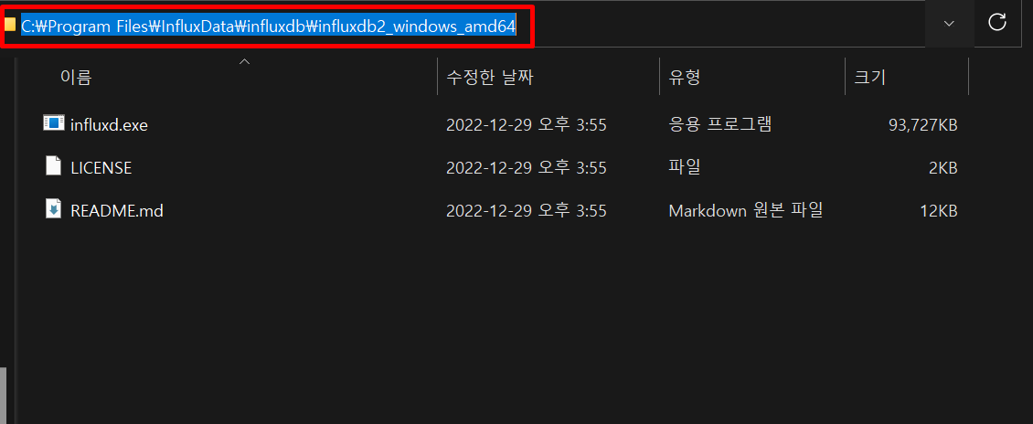-> 인플럭스 db를 다운로드 받아 C:\Program Files\InfluxData\influxdb\ 경로에 위치할수 있도록 설정합니다.