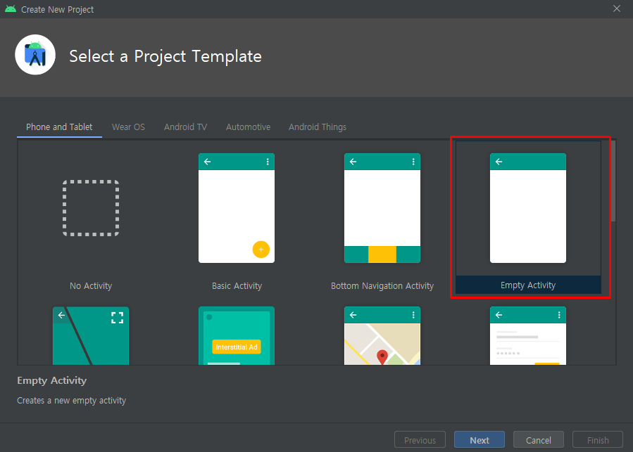 ▶ 안드로이드 버튼을 클릭할경우 다음의 화면이 표시됩니다. 이제 안드로이드 프로젝트를 생성해야 합니다.