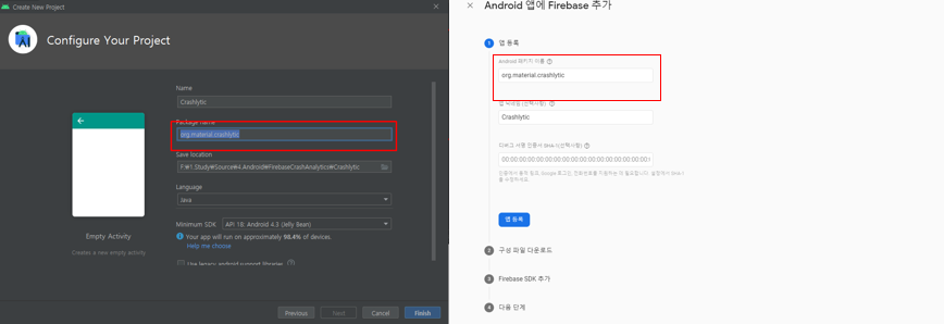 ▶Packge Name을 동일하게 맞춰주고 앱등록을 실행합니다.