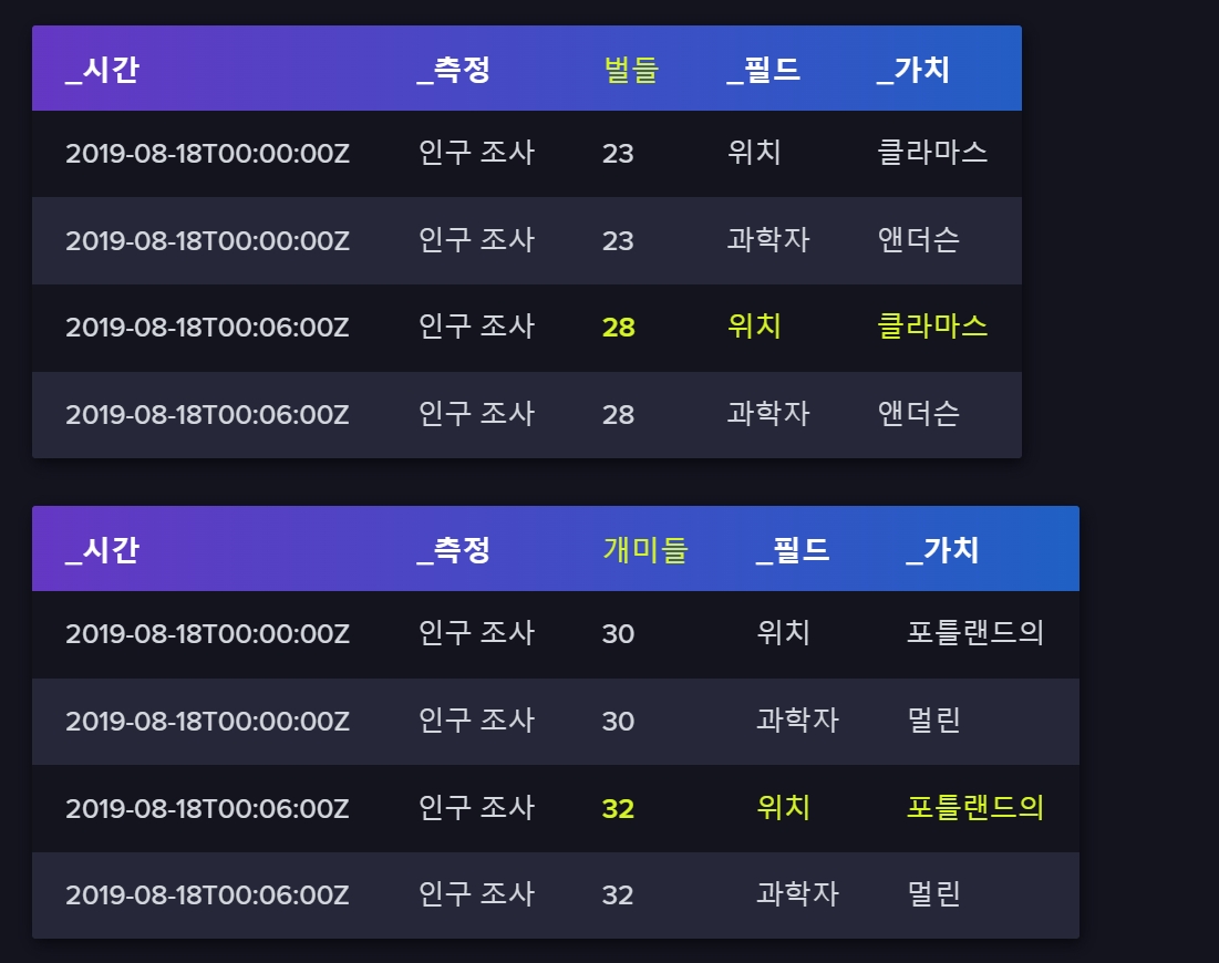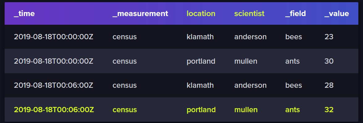 예를 들어, 이 경우에는 census 라는 측정값 이름이 있으며, 이는 기록된 데이터가 벌과 개미의 조사를 나타낸다는 것을 의미합니다 .측정값 이름은 해당 데이터를 정확히 설명할 수 있는 이름으로 선택되어야 하며, 이를 통해 데이터베이스를 이해하고 쿼리하는 데 도움이 됩니다.