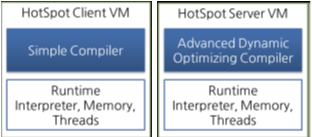 클라이언트 VM과 서버 VM은 각각 오라클 핫스팟 VM을 실행할 때 입력하는 -client, -server 옵션으로 실행된다, 클라리언트 vm과 서버 vm은 동일한 런타임을 사용하지만, 위 그림과 같이 다른 jit 컴파일러를 사용한다. 서버 vm 에서 사용하는 advanced Dynamic Optimizing Compiler 가 더 복잡하고 다양한 성능 최적화 기법을 사용하고 있다.