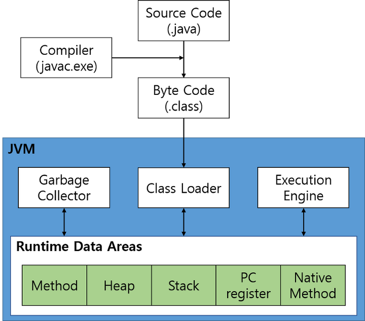 - 작성한 자바소스(JAVA Source), 즉 확장자가. java인 파일을 자바 컴파일러(JAVA Compiler)를 통해 자바 바이트코드(JAVA Byte Code)로 컴파일한다.