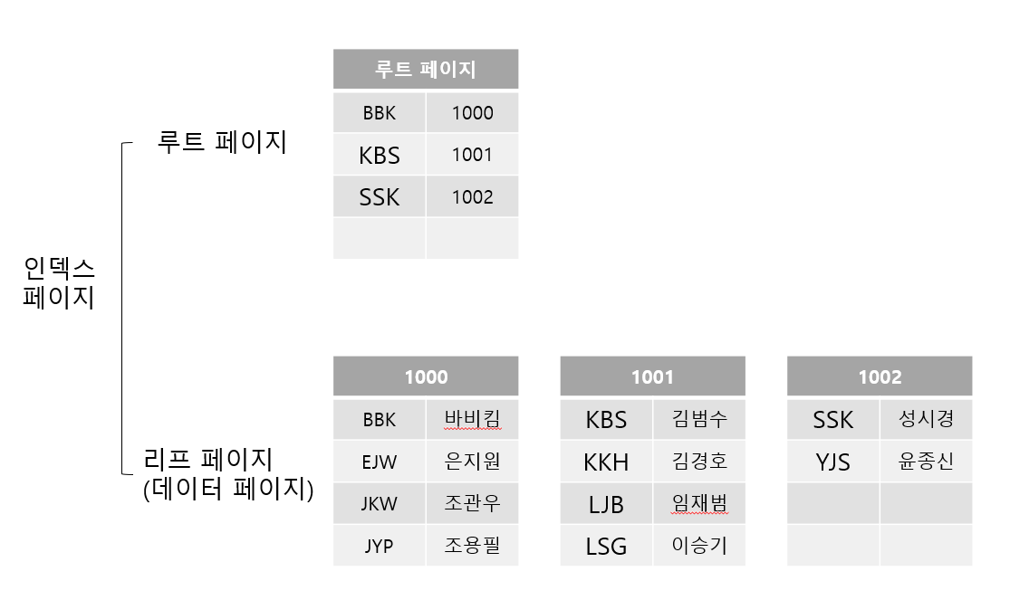 - 그리고 비클러스터형 인덱스에도 100번 페이지에만 김현중 KHJ가 추가되면서 데이터의 순서가 약간 변경될 뿐 그렇게 큰 변화가 발생하지는 않을 것이다.