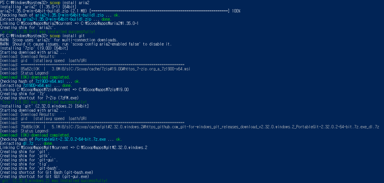 네 번째 명령은 scoop을 이용해 aria2를 설치합니다. aria2를 설치해 놓으면 scoop이 다중 내려받기를 할 수 있어서 프로그램 설치 시간이 절감됩니다.