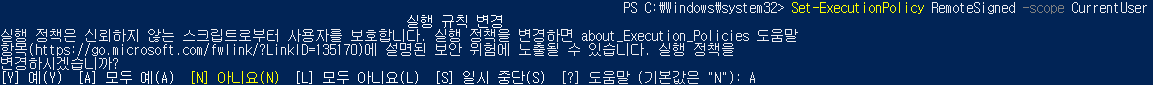 첫번째 명령은 세번 째 명령이 정상적으로 동작하도록 윈도우 실행 규칙을 변경합니다. 이때 실행 정책 변경을 묻는 질문에 A를 입력 합니다.