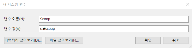 scoop으로 프로그램을 설치할 때 앞에서는 $env:Scoop 명령으로 설치 경로를 지정했습니다. 만약, 프로그램을 설치할 때마다 경로를 지정하는 것이 번거롭다면, 윈도우 환경 변수에 설정해 주면 됩니다. 윈도우 검색에서 '시스템 환경 변수 편집'이라는 키워드로 찾으면 환경변수를 설정할 수 있습니다. 새 사용자 변수 창에서 '변수 이름'에 "Scoop"을 입력하고 변수 값에 경로를 입력 합니다. 이로써 Scoop이라는 이름의 환경 변수가 윈도우에 등록됩니다.