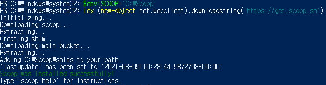 두번째 명령은 앞으로 scoop을 이용해 설치하는 모든 프로그램의 경로를 'C:\Scoop'으로 설정합니다.