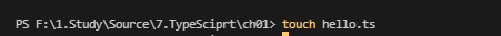 VSCode의 퍼미널에서 touch 명령으로 hello.js 파일을 생성합니다. 그러면 VSCode에서 왼쪽에 보이는 탐색기에 새로 생성된 hello.ts가 보입니다.